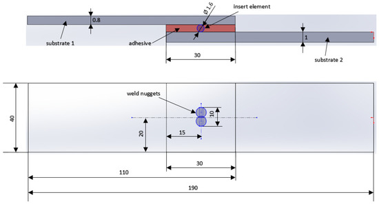 This type of joint was created by welding the insert element to the aluminum plate. Next, a layer of the adhesive was applied on the aluminum substrate manually using a plastic blade. The thickness of the adhesive was at the level of the insert element height. The joint was then covered by the steel plate, and resistance welding was performed again. As the last step, when double RSW was completed, the curing of the adhesive took place at 175 °C for 25 min.
