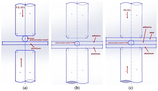 Schematic representation of joint formation using adhesive: (a) welding of insert element to aluminum, (b) application of adhesive on aluminum substrate, (c) welding of steel plate to insert–aluminum joint.