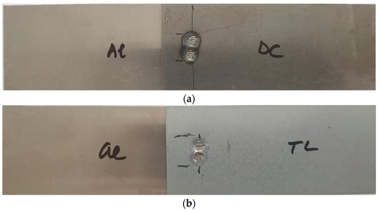 Similar to the Al-DC test samples, only two representative samples are shown after the tensile shear test of Al-TL joints (Figure 8). The same pattern of joint destruction was observed for the four samples, with the greater part of the bonding element remaining welded to the Al substrate, as is shown in Figure 8a. An exception is sample 4 (Figure 8b), where most of the bonding element remained on the TL substrate. On the TL substrate, in the area around the spot weld, extrusion of the Zn layer occurred. As with Al-DC, we do not observe plastic deformation in any sample.