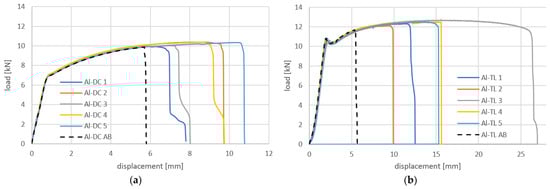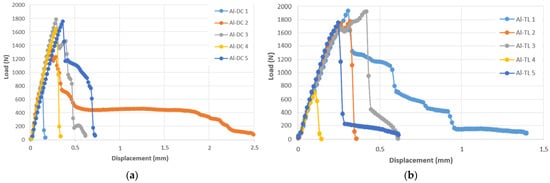 The load–displacement curves obtained in the tensile shear test of Al-DC and Al-TL test joints are shown in Figure 9. The load curves are nearly linear up to the point of failure and then cascade downward, corresponding to the gradual detachment of the substrates from the insert element. A slightly higher load at failure was recorded for the Al-TL joint compared to the Al-DC joint.