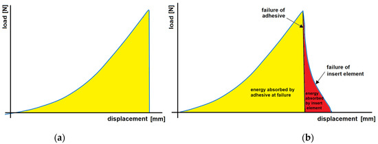 Again, dashed black lines in Figure 18 indicate the load–displacement curves of the adhesive joint only (without welding and the insert element). Compared to the pure adhesive joint, a significant increase in the energy absorption of the joint made by hybrid joining was again shown.