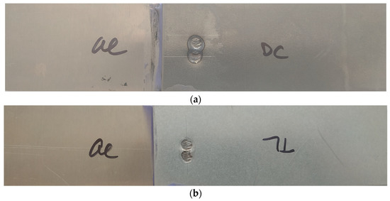 Materials were cut to 40 × 110 mm test samples. Next, the test samples were degreased, coated with an adhesion promoter and joined together by welding, with welding and adhesive bonding having an overlap of 30 mm in the configurations DC-Al and TL-Al (Figure 1). Five test joints were made for each material combination, joining technology and adhesive used (Table 3).