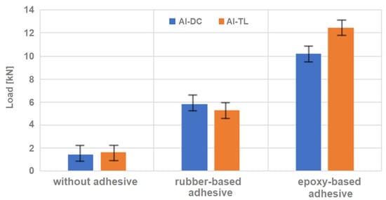 Figure 19 shows the average loads at failure for Al-DC and AL-TL joints without an adhesive and with rubber-based and epoxy-based adhesives.
