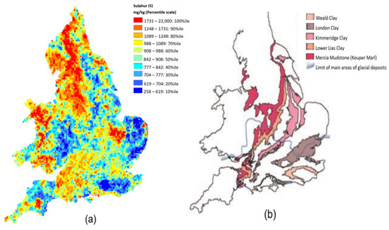 (a) National Soil Inventory Topsoil Sulphur Concentrations [20]. (b) Major Sulphate/Sulphide-bearing Strata in England and Wales [19].
