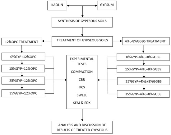 The OPC treated samples were prepared by mixing dry kaolin with gypsum and allowed for 24 h before applying 12%OPC treatment and compacting, as stated earlier. For the L-GGBS treated soils, samples were prepared by mixing pre-constituted gypseous soils first with 4%lime and left for 24 h to allow for mellowing, after which 8%GGBS by weight of dry gypseous soil was added and mixed thoroughly to ensure homogeneity. The addition of lime before GGBS has been suggested by Higgins [53] to be suitable for the treatment of cohesive soils. The treated gypseous soils were then mixed with distilled water and compacted on the wet-side of optimum at 110% of the OMC of the untreated gypseous soils by gradual addition of the pre-determined mass of water while continuously mixing the soil to ensure uniform wetness for each batch. Three samples were prepared for each mix ratio and curing period for both 7 and 28 days curing for UCS, 2 samples were prepared for each mix ratio for Soaked and Unsoaked CBR. Samples were also prepared for swell, SEM, and EDX tests following the experimental flow chart shown in Figure 2.