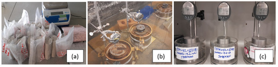 For the CBR samples, a total of 96 cylindrical samples of 152 mm diameter and 127 mm height were prepared for both soaked and unsoaked CBR test. The CBR samples were also cured while preventing loss of moisture according to [55] before soaking in water at 20 ± 2 °C for 96 h prior to testing, as shown in Figure 3b. The unsoaked CBR samples were tested at the end of the curing period without soaking.
