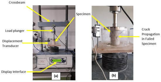 UCS was conducted on cured cylindrical samples using in a VJ Tech 50 kN triaxial load frame in accordance with [56]. Three samples were tested for each mix ratio in line with [54] and the mean UCS was determined for analysis. The UCS was obtained as the ratio of the applied load to the cross-sectional area of the cylindrical samples. The samples were loaded at a strain rate of 1 mm/min while automatically logging the applied force and sample deformation to a dedicated computer system. The samples were then loaded to failure as shown in Figure 4 or until a 15% strain was attained at which point unshared samples were deemed to have failed.