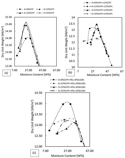 Compaction curves of the treated and untreated gypseous soils. (a) Untreated gypseous soils. (b) 12%OPC treated. (c) 4%L and 8%GGBS treated.