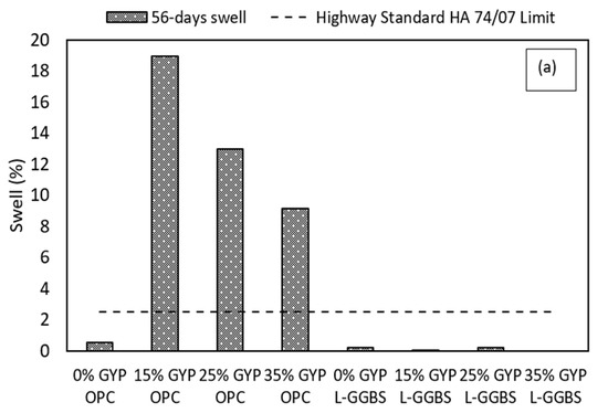 Swelling of OPC treated sulphate bearing soils is an unwanted behaviour, especially underneath light-weight structures such as road pavements. OPC treatment of sulphate-bearing soils has been shown to result in significant swelling and expansion when subjected to water ingress [1,62,63]. This behaviour leads to the development of early tension cracks in heaved sections of flexible pavements. To evaluate the swell response of the OPC and L-GGBS-treated gypseous soils, vertical swell tests were conducted on stabilised samples. Figure 6 shows the swell results of the treated soils after 56 days soaking in comparison to significant swell benchmarks [64] and the Highway Standards as specified in [21] and shown in Table 5. From the results, the swell of all gypseous soil samples treated with 12%OPC increased rapidly within the first 10 days and eventually exceeded the limit of 2.5% specified in [21].