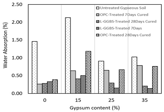 The water absorption of the gypseous soils with higher gypsum content was observed to be lower for both Untreated, OPC, and LG treatment. This is a direct effect of increased cementation with the known effect of sealing pore spaces with cementitious gel, increasing density, and reducing soil permeability [70]. The reduced water absorption of the untreated gypseous samples indicates that the presence of gypsum might have induced slight resistance against water ingress. This behaviour of the untreated gypseous has been highlighted in earlier research reporting on the effectiveness of gypsum as a stand-alone binder and in combination with lime in improving the strength and reducing the water absorption of some treated soils [71]. However, further reduction in the water absorption of the gypseous soils was observed following OPC and L-GGBS treatment, as shown in Figure 7.