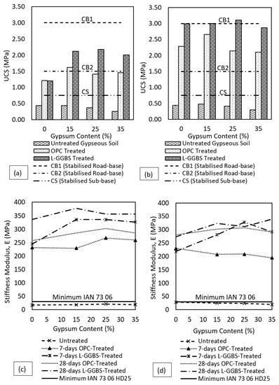The stiffness modulus of the stabilised soil is presented in Figure 8c,d. The stiffness modulus was estimated based on the empirical relation given by Powell and others [76] and suggested in [77]. The stiffness modulus is a key parameter in the selection of base thicknesses of pavement foundations in the design of flexible pavements. The untreated gypseous soil samples under soaked condition, as expected, showed low stiffness below minimum requirement across all gypsum contents while the treated samples improved significantly for both binders. Under soaked conditions, the stiffness modulus was higher than that of the unsoaked samples. As earlier mentioned, soaking for 96h enhanced the curing process and lead to better bond development which improved the stiffness of the treated soil. As with the UCS result, the stiffness of the L-GGBS treated samples where higher than the OPC-treated samples. The seven days cured L-GGBS treated samples showed higher stiffness than the 28-days cured OPC treated counterparts at higher gypsum contents. This again highlights the advantage of the L-GGBS treatment over the OPC in high sulphate-bearing soils.