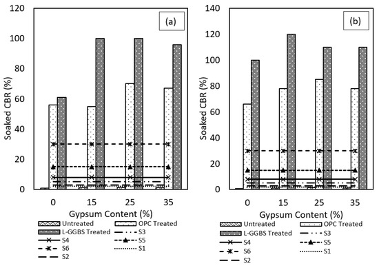 Soaked CBR results for OPC and LGGBS treated gypseous soils. (a) 7-days cured. (b) 28-days cured.