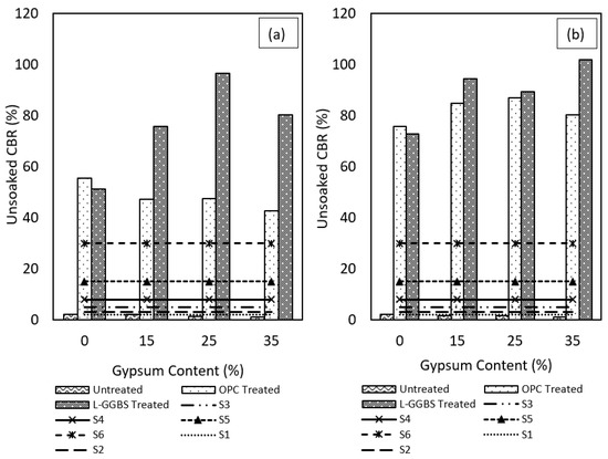 The unsoaked CBR result shows similar behaviour of the treated gypseous soils. Increasing the gypsum content increased the sulphate content and reduced the penetration resistance of the stabilised soils. As with the soaked condition, the 28-days cured samples performed better with higher CBR values as shown in Figure 10a,b.
