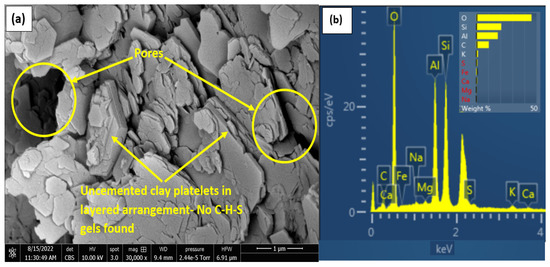 To investigate the microstructural characteristics and mineralogical composition of the soil samples, SEM and EDX studies were carried out on chunks of stabilised samples. The soil samples for SEM and EDX analyses were taken from the middle sections of large CBR samples in order to obtain better representative samples for microstructural study following treatment. The samples were gold-coated in an Emscope SC 500 unit within 1 min using a current of 7.5 mA at a vacuum pressure reading of 0.1 Torr during coating. Samples were glued with a Leit-C conductive carbon cement and allowed for 48 h to dry prior to analysis. The samples were put in a FEI QUANTA FEG 650 SEM Unit at a chamber pressure of about 9.5 × 10−7 Torr and an accelerating voltage of 5–20 kV [57]. The micrographs were taken at varying levels of the stage at 10–20 mm depending on the size of the sample. EDX was utilised in evaluating the oxide composition and concentration.