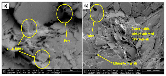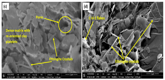 Upon treatment with OPC, an increase in formation of C-S-H compounds is observed in the matrix, as shown in Figure 12a, which results in a better interlock of the particles with reduced pores and increased strength. The LGGBS treated non-gypseous soil showed lower pores as seen in Figure 12b. The non-gypseous soil treated with 12% OPC showed more pores with relatively isolated agglomeration of kaolinite plates with C-S-H gel flakes seen on the plates as shown Figure 12a. When compared to Figure 12b, it is clearly seen that the morphology is characterised by a denser matrix, the kaolinite plates are not seen to be as isolated as in the OPC-treated 0% gypseous soil. This suggests a sharp distinction in both treatments even at the 0%gypsum content. For the treated gypseous soils, the micrographs show that a more sealed soil-binder phase is achieved with the addition of gypsum. While the higher gypseous samples had early ettringite crystal formation, as expected, due to the increased reaction between sulphate ions from gypsum and the tricalcium aluminate (C3A) in OPC which seeks to slow down the setting rate [81].