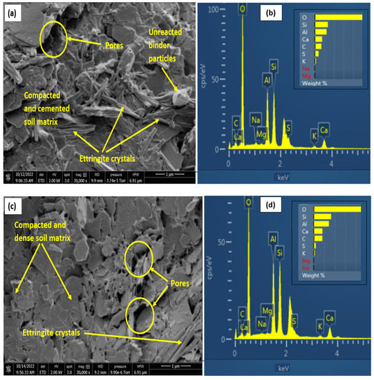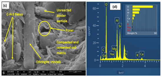For the 7-days cured samples, the samples with 35% gypsum content showed a higher compactness, as shown in Figure 12c,d, which would reduce the swell and water absorption. This characteristic aligns well with the swell curves shown earlier. Earlier research work [27,48] have highlighted the fact that more gypsum, above a critical percentage, led to increased cementation and resulted in lower water absorption and expansion. Furthermore, for the treated samples, SEM and EDX results at 28-days curing, as seen in Figure 13 and Figure 14, show more binder flakes and crystals synonymous with long-term curing.