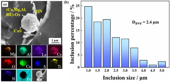 To better observe and analyze the composite inclusions, they were separated by electrolysis in a non-aqueous solution (Figure 2a). In this work, the inclusions are found to be almost spherical in shape, forming a typical core–shell structure, with (RE–Mg–Al–Ca)–OxSy in the center and CaS and TiN at the periphery. The addition of Zr, Ca and RE has an obvious spheroidization effect on the inclusions [,,]. The appearance of Mg is attributed to the refractory bricks used in steelmaking. However, Zr was not detected on this exposed surface. Rare earth elements could induce various types of inclusions such as (Al, Zr, RE)-Ox, (RE)2OxSy, and (RE)xSy [,]. According to statistical analysis, (RE–Zr–Mg–Al–Ca)–OxSy–TiN composite inclusions are formed in this tested steel. Figure 2b shows the equivalent particle size distribution of the inclusions. Nearly 85% of the inclusions are less than 3 µm in diameter, with a total average diameter of the inclusions of 2.4 µm and a particle number density of 18.27 mm−2. It should be noted that the inclusions with a particle size less than 1 µm are not included in Figure 2b.