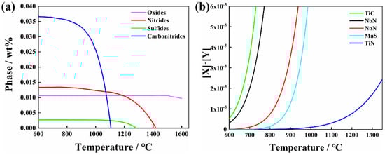 During the heating process of welding, small precipitations such as TiN and NbC redissolve into the matrix, which reprecipitates again during the cooling process [,,]. This is well described by the expression of solid solubility product at the specific precipitations, as shown in Equation (13):