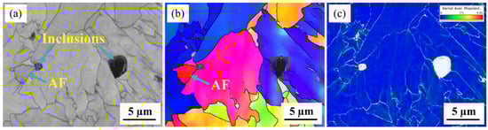 EBSD characterization of the same area containing complex inclusions. (a) IQ map, (b) IPF map and (c) KAM map.