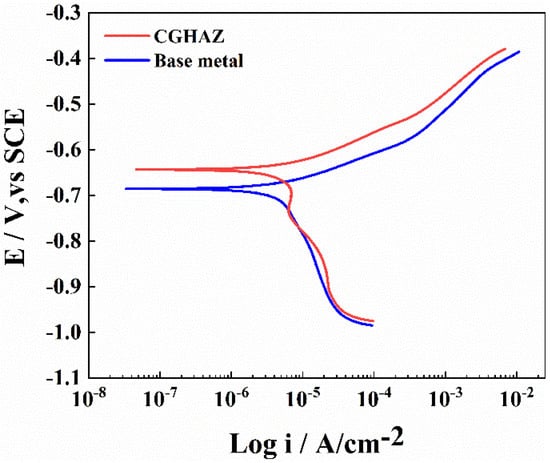 Potentiodynamic polarization curves of the base metal and CGHAZ (100 kJ/cm) of the tested steels in 3.5 wt.% NaCl solution.