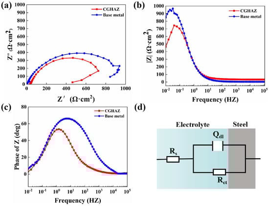 The impedance diagrams for the base metal and CGHAZ in 3.5 wt.% NaCl. (a) Nyquist plots, (b,c) Bode plots and (d) proposed equivalent circuit.