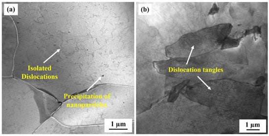 The elastic mechanical properties of the inclusions involved in this paper are shown in Table 6 and were determined using the first-principles calculation method. According to calculation results, LaAlO3 and La2O7Zr2 have lower bulk modulus than Al2O3 (249.54) and ZrO2 (271.06), and the bulk modulus of LaAlO3 (192.61) is closer to that of the iron matrix (194.76). The results indicate that LaAlO3 has excellent mechanical compatibility with the matrix. Numerous studies have demonstrated that the visible microcrevices and high-density dislocations between Al2O3 and the matrix are due to the significantly higher hardness and irregular shape of Al2O3 compared with the iron matrix [,]. Inclusions, such as CaO (114.11), MgO (165.84), TiN (175.02) and CaS (57.05), exhibit lower bulk modulus than the matrix. Rare earth elements can form rare earth oxides and composite inclusions, such as LaAlO3 and La2O7Zr2, due to their stronger affinity for oxygen than Zr, Ti and other deoxidizers []. The spheroidization and softening effects of rare earth elements on the inclusions can reduce the stress concentration around the inclusions [,,]. This is consistent with the absence of microcracking that was observed between the inclusions and the matrix (Figure 4 and Figure 8a).
