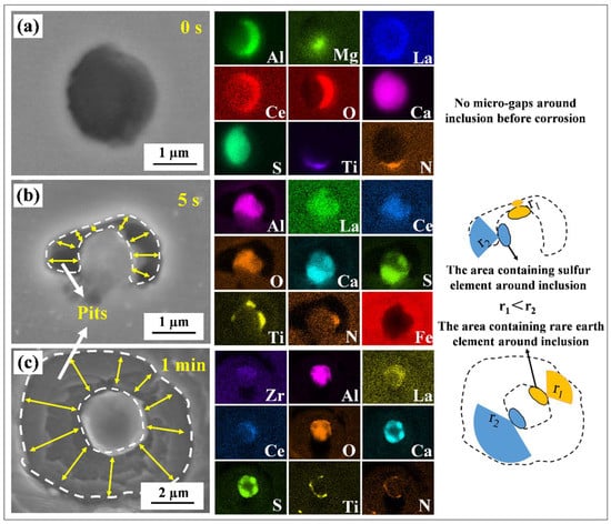 Figure 8a displays the typical morphology—before the immersion test, without any microgaps around the inclusions—of one of the inclusions of interest. As indicated in Figure 8b, a slight dissolution of the matrix occurred around the inclusions after a 5 s immersion. Meanwhile, an anisotropy was observed in the matrix dissolution rate around the inclusions. In this study, the sulfide was identified as CaS. Using SEM-EDS analysis in conjunction with the immersion test, it was shown that the matrix near the CaS at the inclusion surface exhibited a relatively larger corrosion rate than that near the rare earth complex oxides (such as LaAlO3) at the initial stage of the pitting corrosion, i.e., r1 < r2. The matrix around the inclusions further dissolved with the ongoing immersion test (Figure 8b,c) and formed ring-shaped pits due to the weakened anisotropy. Therefore, since the sulfides in the inclusions are susceptible to hydrolysis and produce acidic solutions, which accelerates the pitting occurrence, the sulfide attached to the oxide surface is easily transformed into the starting point of the pitting corrosion [,].