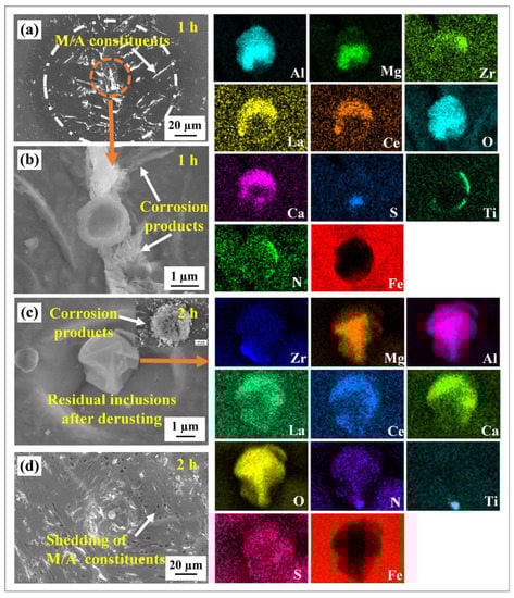 Furthermore, after immersion for 1 h, a small amount of corrosion products were found on the surface of the M/A island distributed around the inclusion in the near-circular corrosion area, implying that the corrosion attack occurred in this region (Figure 9a). The micropores were observed around the inclusion after 2 h of immersion (Figure 9d). The microcouples were found to be formed between the M/A constituents and the ferrite matrix, with the ferrite matrix acting as the anode phase and the M/A constituents as the cathode phase [,]. The M/A island gradually fell off with the corrosion dissolution of the ferrite matrix.