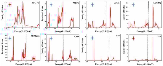 In the present work, density of states of the inclusions of interest were calculated to determine the electrical conductivity. It can be seen that the Fe matrix and TiN (red star) have metallic nature, whereas Al2O3, ZrO2, LaAlO3, La2O7Zr2, MgO, CaO, CaS and Al2MgO4 (blue star) exhibit the properties of insulators (Figure 10). The matrix and TiN exhibit electrical conductivity, whereas the other oxidation or sulfide inclusions exhibit the properties of insulators or semiconductors. TiN holds intact in the immersion test, which could be attributed to its insolubility in strong acids at room temperature and pressure [,]. In summary, the composite inclusions in the test steel will not form a microcouple effect with the matrix.