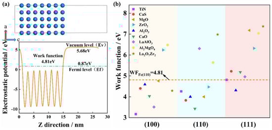 Calculated work function of the inclusions and Fe matrix. (a) Electrostatic potential curve of Fe (110) slab model, (b) work function of the different crystal planes (low index) of the inclusions.