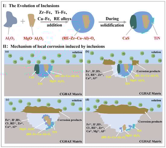 Figure 12I illustrates the evolution process of the inclusions involved in this paper. The addition of Zr–Fe, Ti–Fe, Ca–Fe, and RE alloys during the smelting process modified the Al2O3 inclusions into composite inclusions. CaS and TiN precipitated on the previously formed inclusions at a later stage of solidification, ultimately forming composite inclusions with a core–shell structure [,,]. Figure 12II illustrates the schematic diagram of the initiation and propagation of the pitting corrosion triggered by these composite inclusions in the tested steel. As mentioned above, the mechanisms of galvanic coupling corrosion and the crevice and stress corrosion formed between the inclusions and the matrix could be excluded in this study. Since the composite inclusions are exposed to a corrosive environment with Cl- (Figure 12IIa), CaS with poor stability will preferentially hydrolyze to produce H+ and HS- by anodic reactions (Equations (14) and (15)). As the reaction progresses, the matrix begins to undergo a hydrolysis reaction (Equations (16) and (17)), resulting in further acidification in the pits and further dissolution of CaS [,]. The composite inclusion (RE–Zr–Al–Ca)–Ox and the surrounding matrix were gradually dissolved (Equation (18) under the attack of the increasing H+ with the continued dissolution of CaS. Meanwhile, corrosion products produced by cathodic reactions (Equations (19)–(21)) gradually accumulated at the edge of pits (Figure 12 IIb). CaS was completely dissolved, forming and propagating stable pits with the total corrosion products covering the upper layer. To maintain electrical neutrality, a large amount of Cl- will enter the pitting hole, resulting in the formation of a self-catalytic acidification-occluded corrosion cell (Figure 12IIc). Furthermore, some generated cations, such as Ca2+, Zr4+, Al3+ and RE3+, hydrolyze further, resulting in a drop in the pH value [,,], causing a strong acidic environment in the pits and accelerating the dissolution of the composite inclusions ((RE–Zr–Al–Ca)–Ox and Al2MgO4) (Figure 12IId). TiN inclusion is stable, which is primarily related to its insolubility in strong acids []. With the dissolution of (RE–Zr–Al–Ca)–Ox, Al2MgO4 and TiN inclusions would fall to the bottom of the pits. The anodic and cathodic reactions involved during the pitting initiation and propagation of the Zr–Ti–Al–RE composite inclusions in the tested steel can be summarized as follows: