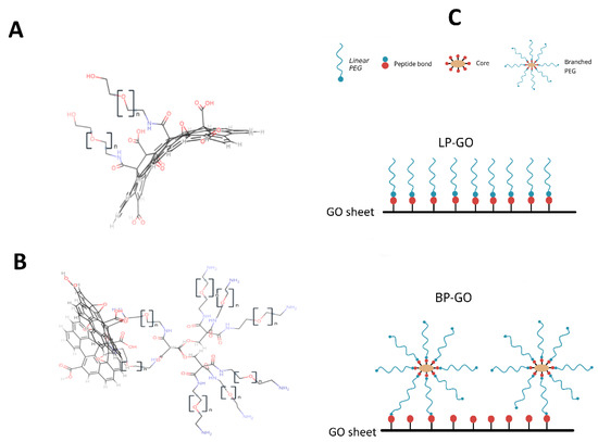 Structural formulas and a schematic representation of the surface of pegylated GO nanoparticles. (A) structural formula of LP-GO nanosheet, (B) structural formula of BP-GO nanosheet, (C) a schematic representation of both types of nanoparticles. Note: the ratio of the sizes of PEG and GO is not met.
