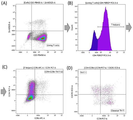 (A–C) Gating strategy of the Th17/22 subpopulation. ((A) live T cells; (B) T helpers; (C) Th17/22); (D) gating strategy of Th17 subpopulations (17.1 and “classical”).