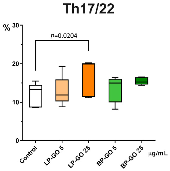 It was found that LP-GO nanoparticles at a concentration of 25 μg/mL significantly increased the percentage of Th17/22 cells in culture (Figure 6). BP-GO had no statistically significant effect on the percentage of Th17/22 cells.