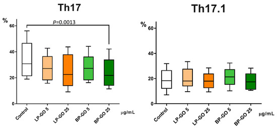 LP-GO, which was added to cultures of polarized T-helpers, showed no effect, whereas BP-GO in high concentration caused a decrease in the number of “classical” Th17 cells. Neither type of nanoparticle had any effect on the proportion of Th17.1 cells (Figure 7).
