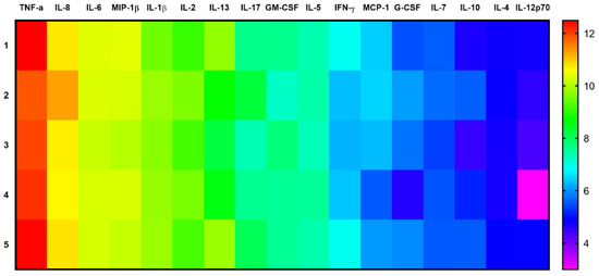 Heat map of cytokine concentrations in control cultures (without GO) of Th17-polarized helper T-cells. Note: n = 5; Cytokine concentrations are shown as natural log-values; IL-1β and IL-6 were introduced into the culture medium in accordance with Th17 polarization method.