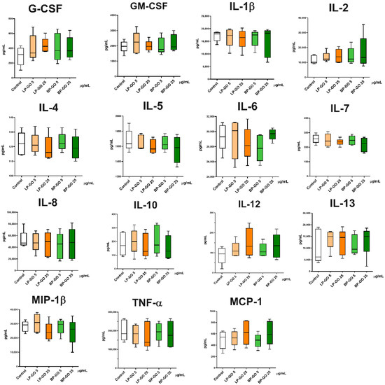 Cytokine profile analysis revealed that both types of PEGylated GO nanoparticles had no effect on the level of MIP-1β, MCP-1, IL-1β, IL-2, IL-4, IL-5, IL-6, IL-7, IL-8, IL-10, IL-12 (p70), IL-13, cytokines, and TNF-α, GM-CSF, G-CSF growth factors (Figure 9).