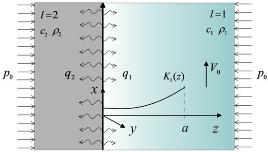 Further, all variables and parameters related to the first semispace are indicated by a subscript , and to the second semispace by a subscript . The first semispace is made of the two-component (base and core) FGM. Suppose that , , are the thermal conductivity, specific heat, and density of the materials of the base () and core (), respectively. The thermal conductivity of the FGM increases exponentially (with the gradient parameter ) in the direction normal to the working surface of the base. The homogeneous material of the second semispace has the coefficient of thermal conductivity , specific heat , and density .