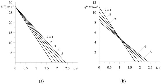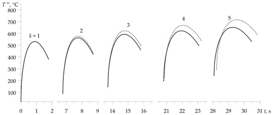 Temporal profiles of the velocity (1), (2) and specific friction power , , are illustrated in Figure 3. A noticeable effect is the extension of the braking stage in each subsequent cycle of the process (Figure 3a). During each of the five braking applications, the intensity of the performed friction work (equal to the area under the graph) is the same (Figure 3b). This fact made it possible to compare the relevant temperature evolutions, demonstrated in Figure 4. This figure shows a comparison of friction surface temperature changes during braking (11)–(24), found with (solid lines) and without (dotted lines) consideration of the dependencies (37)–(45) of material properties on the temperature. Results corresponding to the dotted curves were obtained for the properties of materials (34)–(36) at the initial temperature . In both variants, temperature changes of the friction coefficient were taken into account in form (46).