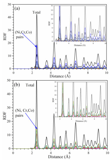 The radial distribution function (RDF) and its partial components (PRDF) from 0 to 10 Å of Hay282 and Inc740 models are displayed in Figure 2a,b respectively. The differences in the PRDF for the (Ni, Cr, Co) pairs are negligible, which is consistent with the data in Table 2 for their first and second NN distance of separations.