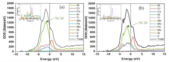 DOS and PDOS of (a) Hay282 and (b) Incon740. The inset shows the contributions from atoms with low participations.