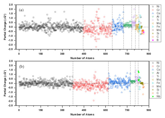 The Ni-based superalloys involve mostly metallic elements with some minor nonmetallic elements. This is even more complicated than those related to the theory of formation of HEAs or metallic glasses (MGs), because they do not contain traces of nonmetallic elements except as impurities or intentional doping. Most of the bonding types will certainly be attributed to metallic bonding. For example, the four metallic elements (Ni, Cr, Co, Al) that make up each alloy represent more than about 90% of the total composition. As much of the composition contributes to the formation of either a disordered FCC and/or an ordered FCC phase e.g., the L12 structure, we have employed the nominal composition as the basis for generating the alloy’s FCC representation. Metallic bonding is multiatomic in nature, different from covalent or ionic bonding where the bond length (BL) is explicitly defined as the distance between the two atoms forming the bond. In MGs, and to a lesser extent in HEAs, the precise assignment on the BL can be ambiguous, since all atoms within a certain distance of separation can contribute to metallic bonding. For a fixed distance of separation for a pair of atoms in the model, there could be many possible BO values, and for a specific value of BO, there could be many possible pairs of atoms with the same distance of separation. A theory that predominantly depends on the geometric parameter of BL, or on atomic size, for interpretation could be problematic. For Ni-based superalloys, these can be represented as “Ni-rich HEAs”, doped with a variety of nonmetallic elements. In any case, the concept of the TBOD is still applicable if the BO values of all the contributing atoms are counted. This point has already been strongly argued in reference [19] for MG. What differentiates HEAs and Ni-based superalloys from MGs is that HEAs have a basic crystal lattice with a face-centered cubic (FCC), body-centered-cubic (BCC), or hexagonal-close-packed (HCP) phase as its structural backbone. However, based on the RSSM description, HEAs or Ni-based superalloys are not necessarily made of simple crystalline phases. They possess more complicated long-range order (LRO) depending on the constituents presents in the alloys and may or may not contain short range order (SRO) in lieu of differing nearest neighbor (NN) and second nearest neighbor (SNN) pairs established by differing bond types generated locally. This is the same predicament that faces the vague description of the so-called lattice distortion, often ascribed to characterize the HEA’s internal crystalline structures [37]. In the current literature, the explanation for lattice distortion has focused mostly on the notion of an averaged valence electron count (VEC) of the constitutional metallic atoms. As shown in Figure 4 in the result section, the partial charge for the metallic atoms has a wide range of variations, not a specific number of electron configurations of metallic elements from the periodic table. Thus, it is more prudent to present the alloys within the context of a quantitative summation of the various bond types and bond strengths normalized to the equilibrium volume. The use of TBOD and its partial components, the PBOD, to explore the theory of formation in Ni-based superalloys is clearly a novel approach. As shown in Table 4, the TBOD values for the two Ni-based superalloys are quite comparable. This is to be expected, because both alloys are composed largely of metallic bonds from the three elements of Ni, Co, and Cr.