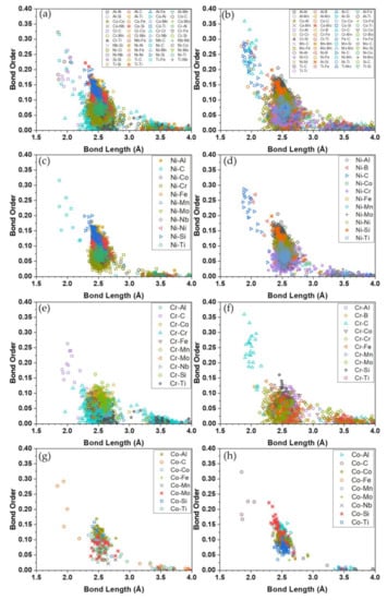 Figure 5 shows the BO vs. BL distributions in Hay282 (left panel) and Inc740 (right panel). The top row ((a) and (b)) shows the data from all pairs, and the lower panels ((c) to (f)) show those involving the Ni, Cr, and Co atoms since they have the largest contributions to the TBOD as depicted in Figure 5. Most of the data points are clustered between 2.5 Å and 2.9 Å, the first NN of the metal atoms. The second NN pairs are the ones above 3.2 Å. The scattered pairs below 2.5 Å atoms mostly involve bonding with nonmetallic atoms, and they have larger BO values.