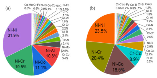 The Pie chart in Figure 6 displays the percentage of each pair to the TBOD in the two Ni-based superalloys from the data points in Figure 5. The top contributors are the Ni–Ni, Ni–Cr and Ni–Co pairs. This is followed by Ni–Al pairs (10.8%) in Hay282 and Cr-Co pairs (8.9%) in Inc740. Such detailed information on complex Ni-based superalloys has not been revealed before but is pertinent to the fundamental understanding of the superalloys physical properties.