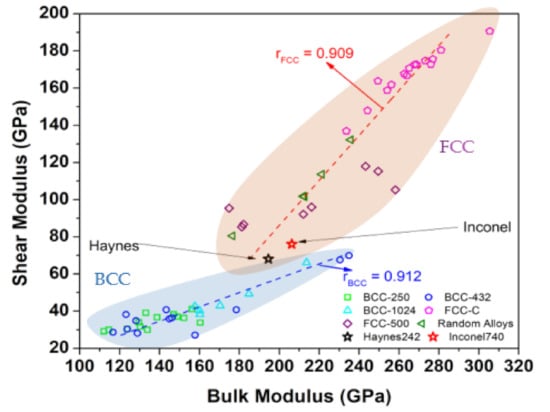 In Figure 7, we compare the G/K ratio with the data for several HEAs, calculated using the same method as for Hay282 and Inc740. Details of the calculations for HEAs can be found in [26,27,28]. Figure 7 shows that the G/K for BCC and FCC HEAs are very different. For FCC HEAs, the G/K = 0.547 is obtained from the average of G/K for each data point and the correlation factor r = 0.909. For BCC HEAs the G/K = 0.256 is from the slope of the fitted line and the correlation factor is r = 0.912. The data for Hanes282 and Inconel740 (marked as open star) fall within the region of the FCC since the supercell models are constructed on an FCC lattice. The fact that they are approaching the region of the BCC HEAs can be attributed to the presence of the non-transitional metal elements in these two Ni-based supercells.