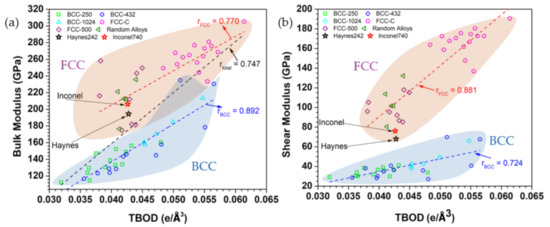 The correlations of the calculated TDOD with bulk modulus and shear modulus and different groups of HEAs are shown in Figure 8a,b, respectively, together with the data for Hay282 and Inc740. Both FCC and BCC HEAs have positive correlations between K vs. TBOD and G vs. TBOD. For bulk modules K, the correlation factor r is 0.770 and 0.892 for FCC and BCC, respectively. For shear modulus G, the correlation factor r is 0.881 and 0.724 for FCC and BCC, respectively. In order words, the degree of correlation is reversed in the case of shear modulus compared with the bulk modulus. The data points for Inconel and Haynes both stay at the lower region of the FCC HEAs, similar to that in Figure 7.