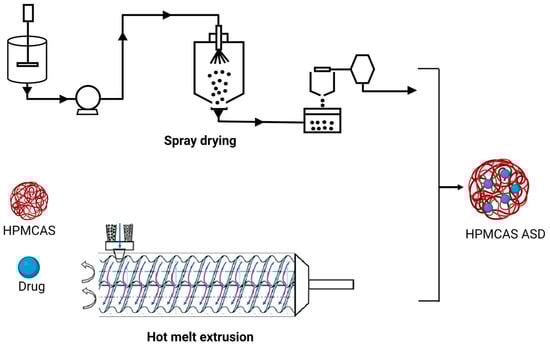 ASDs are single-phase systems in which drug molecules are disseminated or dissolved in one or more polymeric carriers [25]. When compared to pure amorphous drugs, the inclusion of polymeric carriers provides various advantages, including long-term storage stability and improved dissolution capabilities [26,27]. Hydroxypropylmethylcellulose acetate succinate (HPMCAS) has been widely used in ASD formulations as a polymeric carrier. HPMCAS is an effective polymer for the formulation of ASD with dual functionality: solubilization of poorly soluble drugs, promotion of rapid dissolution in the intestinal medium, and prevention of subsequent precipitation of drugs by maintaining supersaturation concentration of the drug molecules [28,29,30,31,32,33]. Several processes, including hot melt extrusion (HME) and spray drying, are used to manufacture ASDs [34]; however, the use of these techniques are dependent on the qualities of the API, desired product attributes and appropriate processing window. Among these approaches, hot melt extrusion (HME) is a supplementary pharmaceutical production technology that is frequently employed by industrial and academic researchers to address API solubility difficulties. In recent years, similar to the lyophilization technique, HME has been used as a drying technique for the solidification or removal of moisture from nanosuspension [35,36]. Though lyophilization is a widely employed drying technique for pharmaceuticals, its usage is associated with time and cost constraints. The main objective of the present review is to discuss HME and spray-drying techniques used to synthesize HPMCAS-based ASDs [37,38,39]. This is followed by providing the marketed formulations of HPMCAS as well as a brief overview of the clinical and patentability aspects.