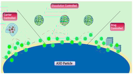 The bioavailability of the drug is enhanced after the drug formulation is present in an amorphous form. A polymer is commonly employed so that the crystalline drug can be converted into an amorphous form diminishing the molecular ability and increasing the glassy temperature [92]. There are various factors that govern the mechanism of drug release from the ASD including the functional charge of the polymer, stereochemistry, selectivity, heterogeneity, etc. [93]. Further, to attain an amorphous nature, the drug crystal lattice is to be broken down, increasing the intermolecular interactions [22]. For a drug to become bioavailable, its dissolution release should be considered [94]. The amount of drug load and formation of colloidal states should be considered. Furthermore, the API should be released from the colloidal state to the molecular state to be allowed to be absorbed from the intestinal medium. There are many mechanisms put forward to understand the release of ASDs in the dissolution medium, such as its conversion into a thick viscous liquid, medium soluble carriers (as in the case of HPMCAS) where the carrier transitions into a colloidal state inhibiting recrystallization to take place [95]. More broadly, it is classified into carrier controlled, dissolution controlled and drug-controlled releases, shown in Figure 2.