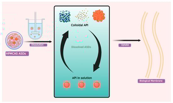 After dissolution and passing through the intestinal medium, the transport may be hampered by solubilized API (such as in micelles from endogenous bile salts or surfactants in the formulation) [96]. The role of HPMCAS-facilitating drug release and increasing bioavailability has been studied and elucidated. It was doubtful that smaller particles that resemble intrinsic properties will be ingested. However, ASDs exhibit benefits with regard to bioavailability as contrasted to other supersaturating (solubilizing) drug delivery systems. In an investigation, the authors used an adjusted model and analogous validation in the previously mentioned rat jejunal perfusion model to examine the impact of particles originating from ASDs (progesterone in HPMCAS) [97]. The particles from ASDs assisted the drug mechanism to occur through the intestinal wall. In another study, based on evaluation tests with Caco-2 monolayers and dialysis membranes, Ueda et al. compared the penetration of carbamazepine as ASDs utilizing HPMCAS or Poloxamer 407 as the polymer component. Carbamazepine was more effectively dissolved by Poloxamer 407 than by HPMCAS. Poloxamer 407, on the other hand, reduced drug penetration while HPMCAS boosted it. The authors hypothesized that carbamazepine is self-associated in the HPMCAS solution and that HPMCAS primarily functions as a crystallization inhibitor, limiting molecular mobility. Unlike HPMCAS, Poloxamer 407 generated micelles that encased carbamazepine [98]. Furthermore, various physiological states have an impact on the ASD mechanism, for example, in one study it was found that surface-active compounds, physiological bile salts, are predicted to have an effect on ASD behavior. According to a study by Stewart et al. on itraconazole in HPMCAS, the impact of drug-rich particles on better penetration across the unstirred barrier was lessened as bile-salt concentrations raised [99]. All these studies highlight the fact that HPMCAS in ASDs prevent the crystal forming ability of a drug once it comes in contact with biological membranes. The general mechanism of ASDs is given in Figure 3.