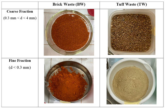 - Waste from red clay bricks (BW): a commercial product supplied by CTS s.r.l. (Altavilla Vicentina, Italy) and recovered from construction and demolition activities, properly sieved and divided it into two particle-size fractions of less than 0.3 mm and between 0.3 and 4 mm.